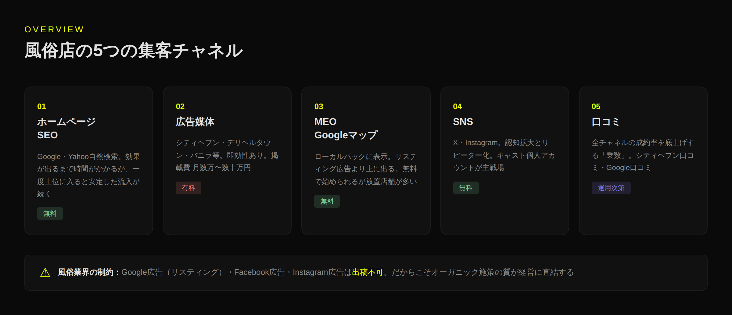 風俗店・デリヘル・ソープ・メンエスのWeb集客を網羅的に解説。ホームページSEO、MEO、シティヘブン活用、口コミ戦略、SNS、分析ツールまで。2026年最新版の完全ガイドです。